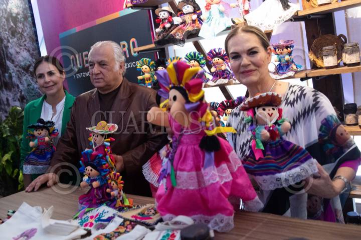 Adriana Vega, Miguel Torruco, y Gloria Garza de la Garza, posan con muñecas Lele durante la inauguración de la exposición "Querétaro" en Punto México de la Secretaría de Turismo.