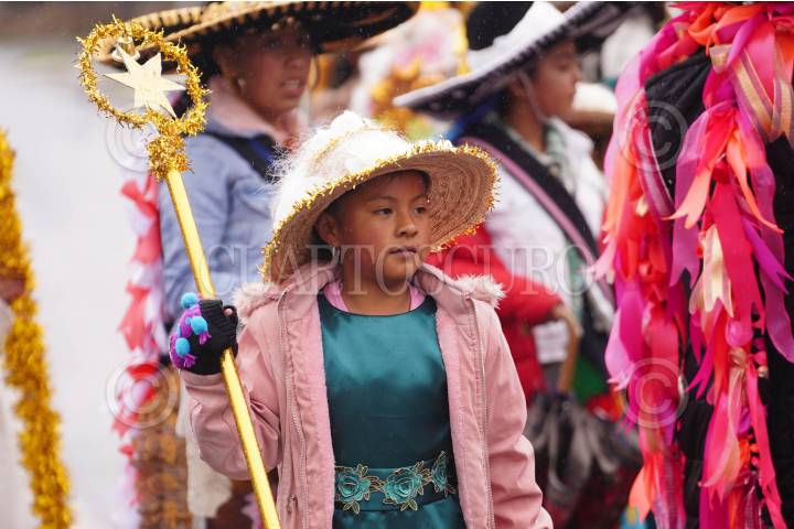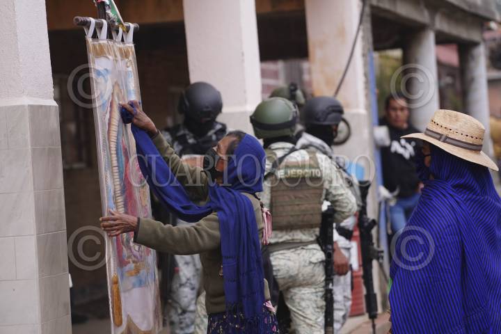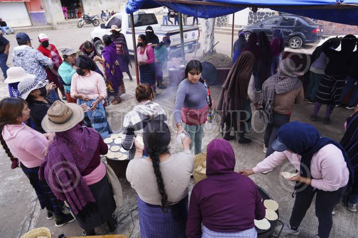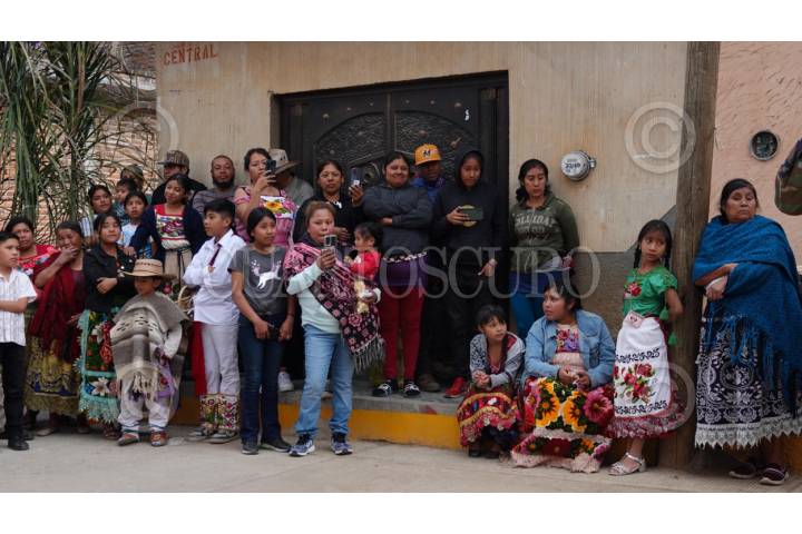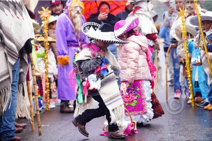 NAHUATZEN, MICHOACÁN, 11ENERO2025.- En la comunidad indígena de Sevina, la Pastorela recorre los cuatro barrios del pueblo: San Bartolo, San Miguel, Santo Santiago y San Francisco. El Tarhé, con máscara de viejito, dirige la danza y cuida que no haya desmanes; él puede ser casado y casi siempre es un adulto mayor. Los Rancheros y Rancheras, con sombreros de charro, son los que relatan y deben ser jóvenes y niños solteros. Las Pastoras llevan vestidos blancos, sombreros adornados y listones de colores. Los Ángeles son los más pequeños, inocentes y devotos que van sorteando obstáculos para llegar a adorar al Niño. Los Ermitaños, de morado y con máscara, cuidan y guían a Las Pastoras y Ángeles. Los Changos, con trajes negros y ribetes de flecos amarillos y morados (diablos), hacen maldades y no quieren que Los Pastores lleguen a ver al Niño; estos también pueden ser señores casados. Llama la atención cómo participan todos con alegría y cómo disfrutan de la convivencia luciendo trajes, máscaras, rebozos y su luminosa juventud. No puede faltar la banda, que conoce bien los sones para acompañar la danza. FOTO: JUAN JOSÉ ESTRADA SERAFÍN /CUARTOSCURO.COM