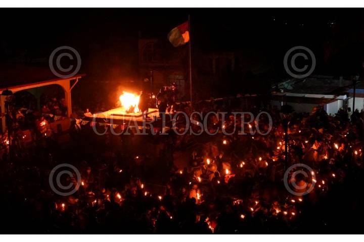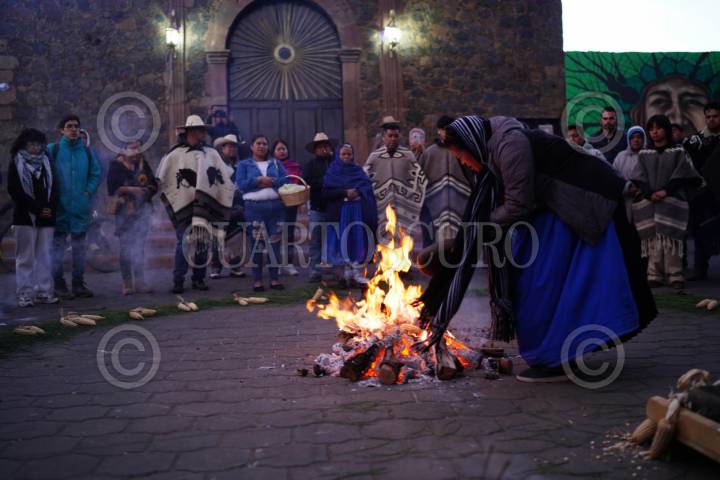 OCUMICHO, MICHOACÁN, 02FEBRERO2024.- Como cada primero de febrero, anoche, cientos de personas de las cuatro regiones purépechas de la Ciénega de Zacapu, Región Lacustre, Cañada de los Once Pueblos y Meseta Purépecha celebraron el inicio de un nuevo ciclo de vida con el encendido del Fuego Nuevo en el Año Nuevo o kurhíkuaeri k'uinchekua, que significa Dios del Fuego. Poco antes de la media noche, los cargueros inician con los preparativos para encender el Fuego Nuevo; todos se reúnen y rodean la yácata que se colocó en medio de la plaza central de Ocumicho, el sonido de los caracoles anuncia que está por iniciar la ceremonia, todos guardan silencio y esperan a que la madera que fue colocada en la cúspide empiece a arder, así las llamas empiezan a subir y con ello se inicia el Nuevo Año Purépecha. El 1 de febrero, la constelación de Orión estuvo a la mitad de su trayecto y con ello inicia el nuevo ciclo de vida; otro de los significados que se da a esta tradición es el inicio del ciclo agrícola. Durante la ceremonia también se determinó que el encendido del próximo año será en Santa Clara del Cobre. FOTO: GRACIELA LÓPEZ/CUARTOSCURO.COM