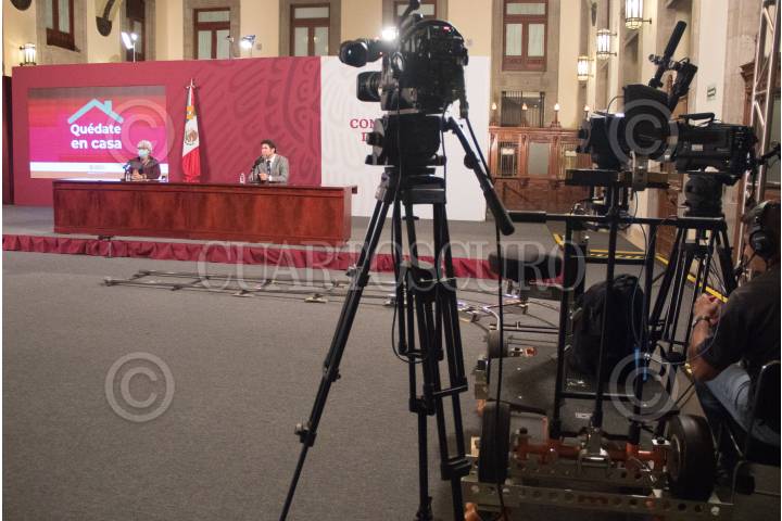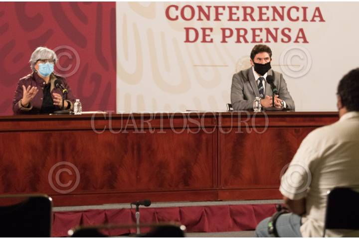Graciela Márquez Colín, titular de Economía y Arquímides Ruiz, en la conferencia de las tardes de apoyos económicos a Pequeñas y Medianas empresas, en el salón tesorería del Palacio Nacional.