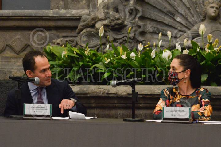 Claudia Sheinbaum, jefa de Gobierno capitalino, y Arturo Herrera, secretario de Hacienda y Crédito Público, y próximo gobernador del Banco de México, durante la presentación del programa Impulso Nafin, el cual busca fomentar el desarrollo económico de las Pequeñas y medianas empresas (PyMES).