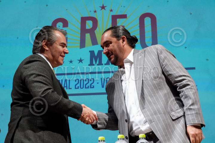 Francisco Cervantes y José Antonio Pérez durante la inauguración de la cuarta edición de Creo MX en el Pepsi Center.