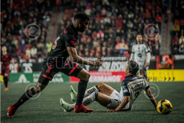 TIJUANA BAJA CALIFORNIA 24ENERO2025.- Domingo Blanco del equipo de Tijuana y Josué Colman del Querétaro. Los Xolos de Tijuana lograron su primera victoria del torneo Clausura 2025 al imponerse 2-1 a Querétaro en el Estadio Caliente, en partido correspondiente a la jornada 3 de la Liga MX. El equipo tijuanense mostró determinación y aprovechó su condición de local para quedarse con los tres puntos. Con este triunfo, el conjunto fronterizo suma 4 puntos en el certamen, demostrando mejoría en su juego y dejando atrás un inicio complicado. La afición en el estadio celebró el esfuerzo y compromiso del equipo, que mostró carácter para asegurar la victoria. Ahora, los Xolos se preparan para su próximo desafío: una visita al estadio de Tigres, en un duelo que promete ser emocionante. Juan Carlos Osorio y su cuerpo técnico trabajan en ajustar los detalles necesarios para encarar a uno de los equipos más sólidos de la liga. FOTO: CHRIS NOYOLA/CUARTOSCURO.COM