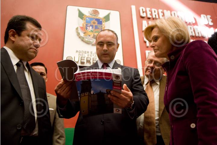 QUERETARO, QUERETARO, 18NOVIEMBRE2009.- El secretario de Desarrollo Urbano y Obras Publicas, Sergio Chufani; el gobernador del estado José Calzada y la subsecretaria de Desarrollo Urbano y Ordenación del Territorio de la Secretaria de Desarrollo Social, Arq. Sara Topelson de Grinberg, durante la presentación del Proyecto del Consejo Asesor de Desarrollo Urbano y Vivienda, en la Ceremonia de Impulso al Desarrollo Urbano Integral y Sustentable del Estado de Querétaro. FOTO: DEMIAN CHAVEZ/CUARTOSCURO.COM