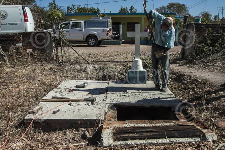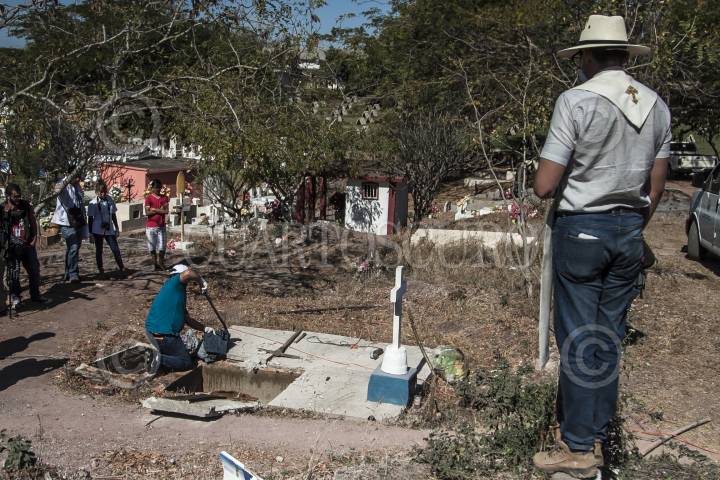 QUELÍTE, SINALOA, 04FEBRERO2017.- En el panteón Ubicado en el poblado El Quelíte autoridades y una comitiva de la tercera Brigada Nacional de Búsqueda de desaparecidos realizaron la exhumación de un cuerpo que fue enterrado en el 2014 supuestamente identificado en su momento como Ernesto Manjarrez Garcia quien meses después apareció en Estados Unidos, peritos realizan las pruebas de ADN para encontrar la verdadera identidad de la víctima. FOTO: RASHIDE FRIAS /CUARTOSCURO.COM