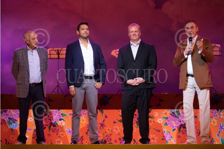Alejandro Garza, Iván Aguilera, Steven Cook y Morris Gilbert durante el estreno de Cirque Música Querida La celebración de Juan Gabriel, en el Teatro San Rafael.