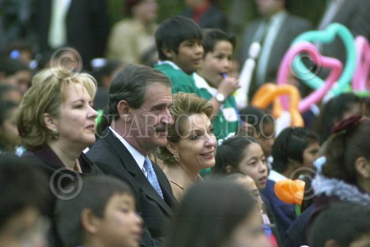 Vicente Fox y Martha Sahagún observando la obra de teatro "La Cenicienta", antes de partir la Rosca de Reyes en la reside ncia oficial de Los Pinos. FOTO: Susana Navarrete/CUARTOSCURO.COM