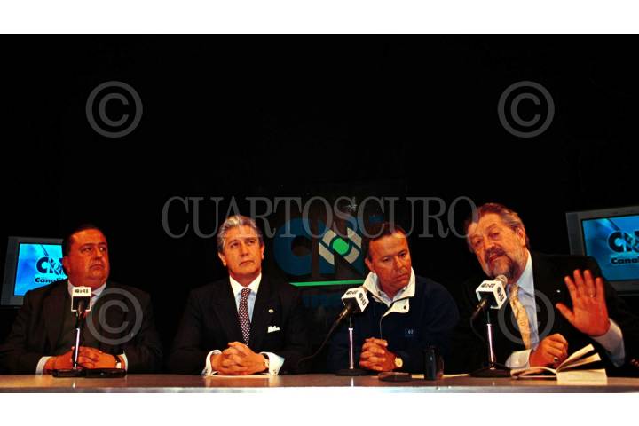 Javier Quijano, abogado del Canal 40, Javier Moreno, dueño de CNI Canal 40, Ciro Gómez Leyva, reportero, Fernando Gómez, abogado del Canal 40, dieron a conocer su postura ante la determinación del gobierno federal en el conflicto entre TV Azteca y Canal 40, acusaron al Gobierno federal de ponerse de parte de TV Azteca. FOTO: Susana Navarrete/CUARTOSCURO.COM