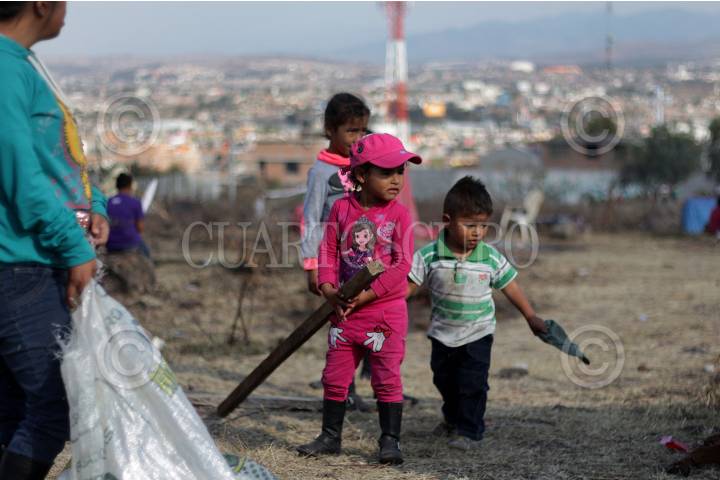 MORELIA, MICHOACÁN, 20ENERO2016.- Un pequeño grupo de niños ayuda a levantar una pequeña casa de madera en el predio llamado Quinceo, que se encuentra a las faldas del cerro del mismo nombre; clasificado cómo reserva natural. Se calcula que unas 60 familias invadieron el predio que se encontraba parcialmente habitado. El Movimiento Antorchista, se hizó presente con algunas 200 personas armados con palos y piedras. Hasta el momento la situación se mantiene en tensa calma. FOTO: ALAN ORTEGA /CUARTOSCURO.COM