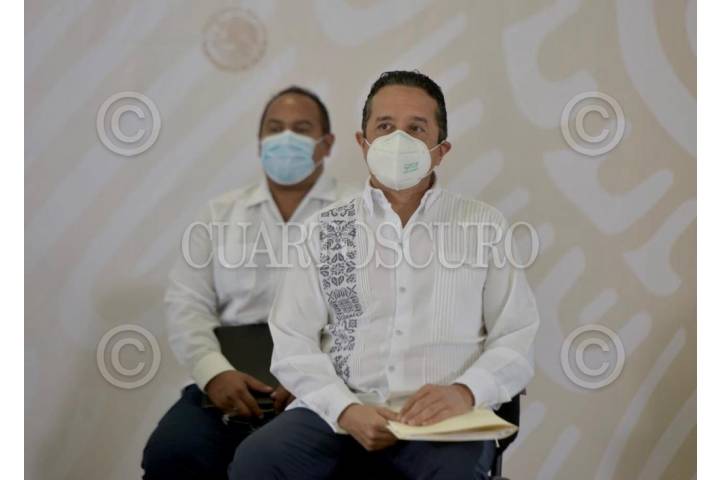 El Gobernador Carlos Manuel Joaquín González en la conferencia de prensa matutina del presidente Andrés Manuel López Obrador en Quintana Roo.