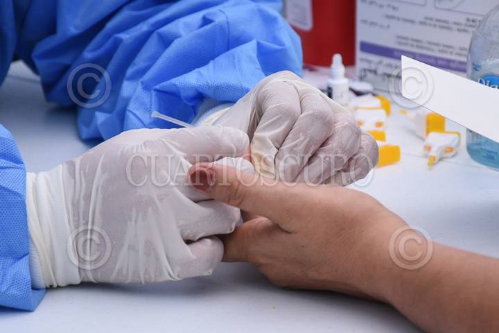 Una médico pincha el dedo de una persona para realizarle la prueba de detección de Covid-19.