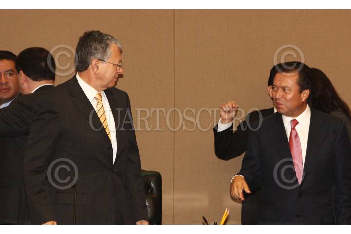 TOLUCA, ESTADO DE MÉXICO, 15AGOSTO2011.- Manuel Camacho Solís y Cesar Camacho Quiroz. El Instituto Electoral del Estado de México, entregó la constancia de mayoría y declararon gobernador electo a “Eruviel Avila Villegas” cargo que asumirá el próximo 15 de Septiembre. FOTO: SAÚL LÓPEZ/CUARTOSCURO.COM