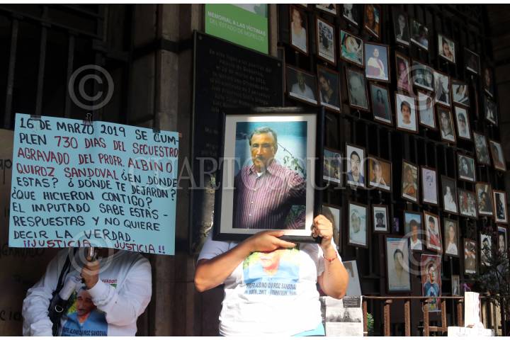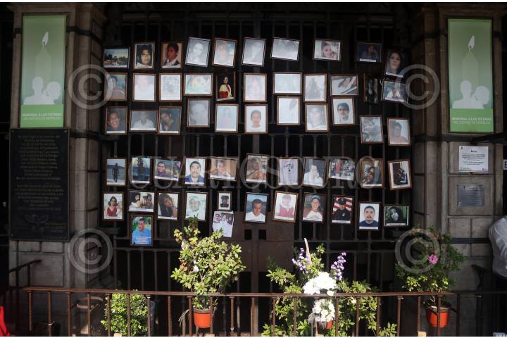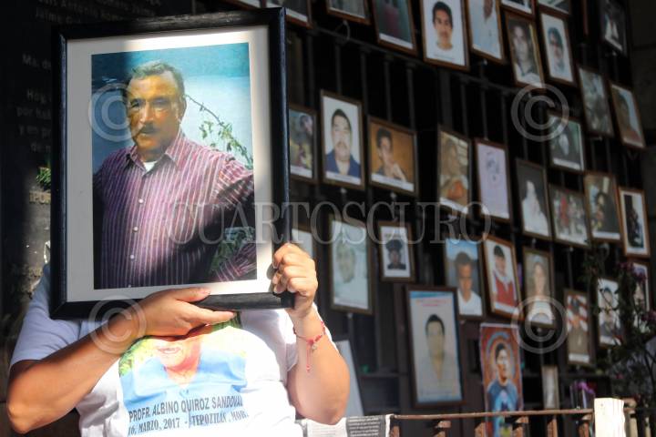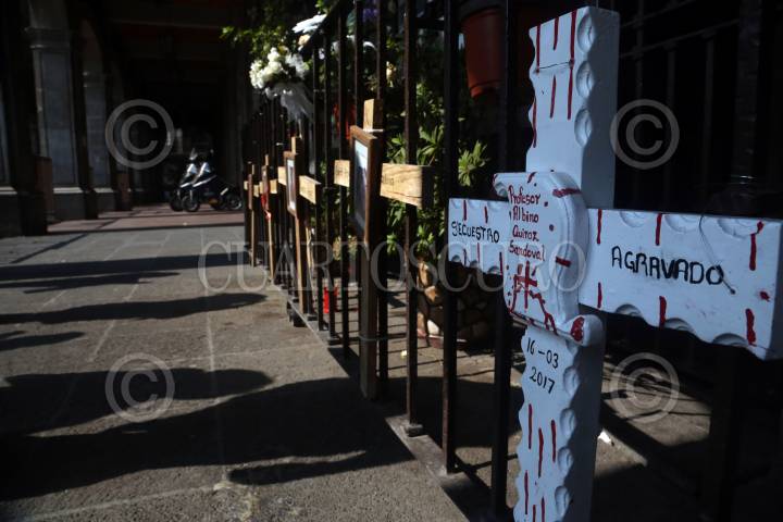 CUERNAVACA, MORELOS, 16MAYO2018.- Al cumplirse 427 días del secuestro agravado del profesor jubilado Albino Quiroz Sandoval, sus familiares colocaron una cruz de madera y su retrato en el Memorial de la Victimas en la entrada del Palacio de Gobierno. El profesor fue secuestrado el 16 de marzo en Tepoztlán, hay un hombre detenido por su participación en el delito, su familia exige un proceso justo. El cadáver de Albino no ha sido encontrado hasta hoy. FOTO: MARGARITO PÉREZ RETANA /CUARTOSCURO.COM