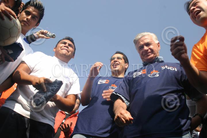 MÉXICO D.F. 20MAYO2006.- Carlos Gelista, presidente de Accion Nacional, Demetrio Sodi, candidato del PAN al gobierno del Distrito Federal y algunos jugadores de la liga Maya de Fútbol Rápido, felicitaron al aspirante al GDF, duarnte su visita a las canchas de Fútbol Rápido Lomas de Torango, en la delegación Alvaro Obregon. FOTO: Diego Gallegos/CUARTOSCURO.COM