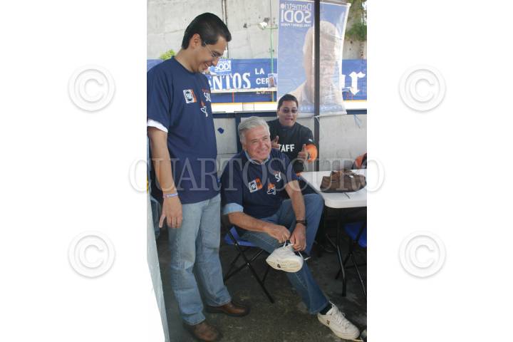 MÉXICO D.F. 20MAYO2006.- Carlos Gelista, presidente de Accion Nacional observa a Demetrio Sodi, candidato del PAN al gobierno del Distrito Federal, mientras el aspirante al GDF se cambia los zapatos para jugar un partido de fútbol, durante su visita a las canchas de Fútbol Rápido Lomas de Torango, en la delegación Alvaro Obregon. FOTO: Diego Gallegos/CUARTOSCURO.COM