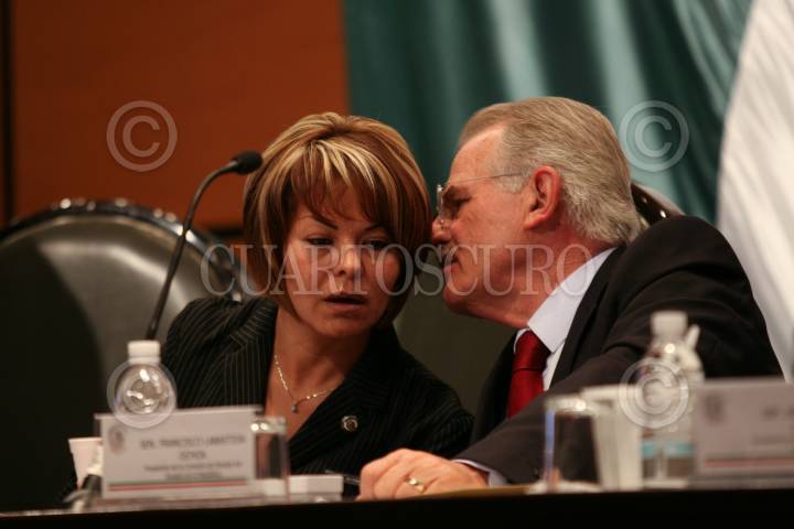 MÉXICO D.F., 14AGOSTO2008.- Se realizó en la Cámara de Diputados el foro con el tema “Análisis sobre la Reforma Energética, Regimen Fiscal de PEMEX”. En la imagen los senadores Minerva Hernández Ramos y Francisco Labastida Ochoa, durante el foro. FOTO: GUILLERMO PEREA/CUARTOSCURO.COM