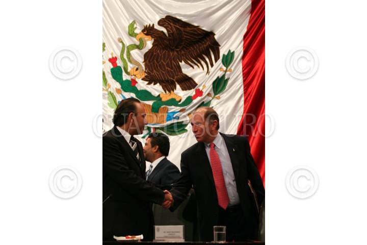 MÉXICO D.F., 14AGOSTO2008.- Se realizó en la Cámara de Diputados el foro con el tema “Análisis sobre la Reforma Energética, Regimen Fiscal de PEMEX”. En la imagen, El diputado Jorge Estefan Chidiac, saluda a Carlos Morales Gil Director General de PEMEX, Exploración y Producción durante el foro. FOTO: GUILLERMO PEREA/CUARTOSCURO.COM