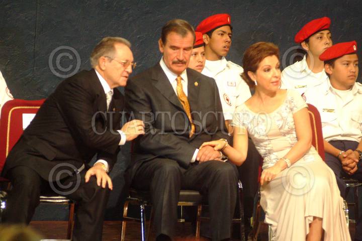 México, D. F. 15 MARZO 2004.- El titular de la Cruz Roja, Olegario Vázquez Raña, el primer mandatario Vicente Fox Quesada y Marta Sahagún de Fox en la ceremonia de inicio de la colecta nacional 2004 de la Cruz Roja Mexicana en la residencia oficial de los pinos. FOTO: Iván Stephens/CUARTOSCURO.COM