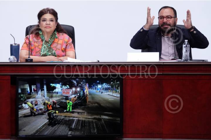 CIUDAD DE MÉXICO, 18AGOSTO2025.- Clara Brugada, jefa de gobierno capitalina, y Raúl Basulto Luviano, secretario de Obras de la ciudad, durante la conferencia de prensa en que anunciaron el inicio del “Programa Integral de Bacheo” en la principales vialidades de la capital. La medida busca reparar 10km por día de las calles y avenidas de mayor importancia en un horario nocturno de las 22:00 a las 05:00 horas. FOTO: GALO CAÑAS/CUARTOSCURO.COM