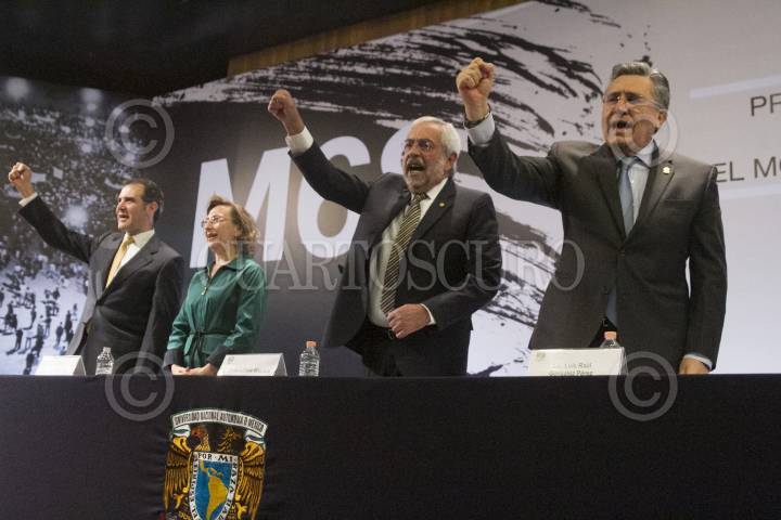 CIUDAD DE MÉXICO, 07MARZO2018.- Lorenzo Córdova Vianello, consejero presidente del INE; la doctora Mercedes de la Vega; Enrique Graue, rector de la UNAM, y Raúl González Pérez, presidente de la Comisión Nacional de Derechos Humanos, durante la presentación del programa conmemorativo por los 50 años del Movimiento Estudiantil de 1968 "M68", que se realizó en el Centro Cultural Tlatelolco FOTO: MOISÉS PABLO /CUARTOSCURO.COM