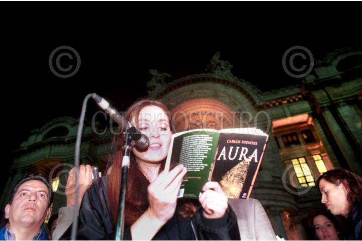 Intelectuales y escritores dieron lectura al controvertido libro de Carlos Fuentes "Aura", en la explanada del Palacio de Bellas Artes, como invitada estuvo la profesora Georgina Rabago la cual fue cuestionada por padres de familia entre ellos Carlos Abascal, secretario del Trabajo. FOTO:Oswaldo Ramirez/CUARTOSCURO.COM