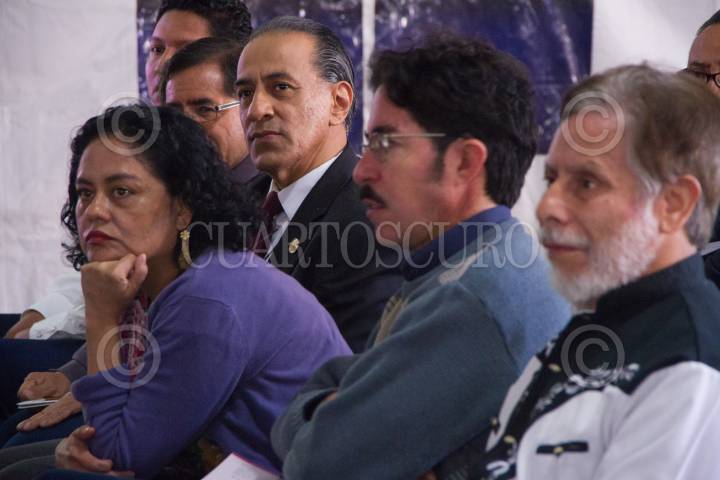 Edmundo Cepeda Delgado, Felipe Ávila Espinoza,, Jesús Alejo Santiago, Paco Ignacio Taibo II, durante la conferencia de prensa del estreno de la radionovela: “Francisco Villa: El revolucionario del pueblo”.