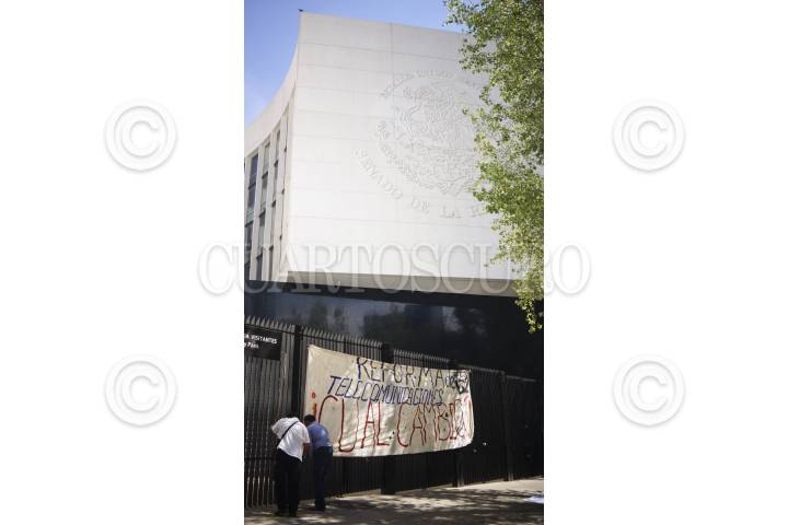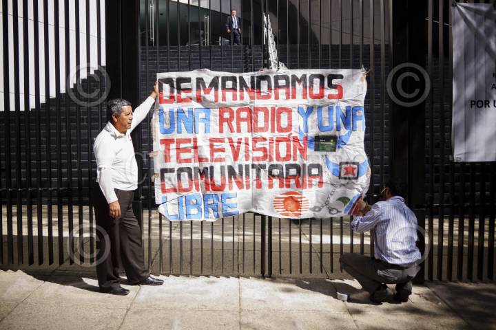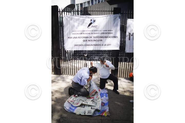 MÉXICO, D.F., 11ABRIL2013.- Integrantes de las radios comunitarias afiliadas a la Asociación Mundial de Radios Comunitarias (AMARC-México) y estudiantes del movimiento #Yo soy 132, se manifestaron frente a la sede del Senado de la República para demandar a los legisladores el reconocimiento en la reforma a la ley de Telecomunicaciones a los medios comunitarios. FOTO: ADOLFO VALTIERRA /CUARTOSCURO.COM