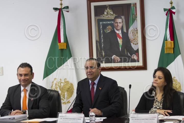 CIUDAD DE MÉXICO, 25AGOSTO2016.- Rafael Avante, subsecretario de la Secretaría del Trabajo; Alfonso Navarrete Prida, secretario del Trabajo y Previsión Social, y Patricia Martínez Cranss, subsecretaría de empleo y productividad laboral, durante la conferencia de prensa para hablar de las creaciones de empleo durante el sexenio, resaltando la cantidad de más de dos millones de trabajos formales. FOTO: MOISÉS PABLO /CUARTOSCURO.COM