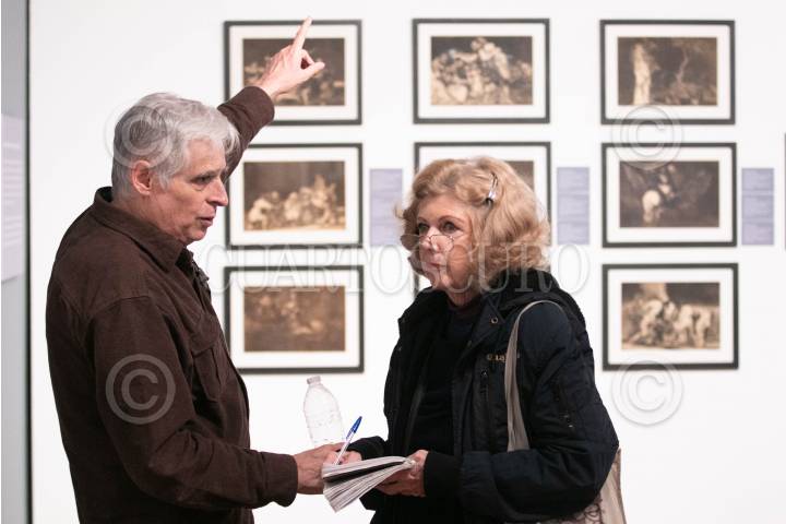 CIUDAD DE MÉXICO, 18ENERO2024.- El caricaturista Rafael Barajas Durán "El Fisgón" le da detalles a la periodista Merry MacMasters de la exposición "Caricatura y Revolución. Los Flores Magón y las Revistas Satíricas de Combate", la cual se encuentra en el Museo del Estanquillo. FOTO: MOISÉS PABLO/CUARTOSCURO.COM