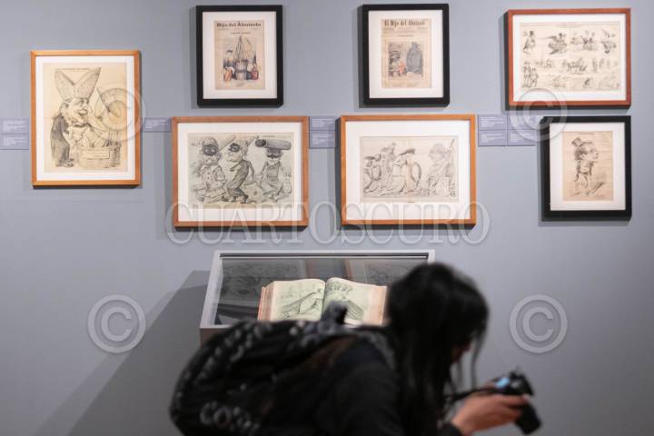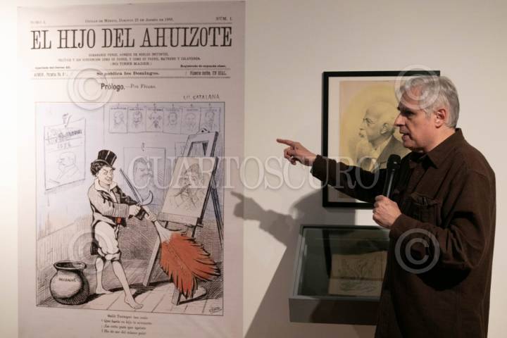 CIUDAD DE MÉXICO, 18ENERO2024.- El caricaturista Rafael Barajas Durán "El Fisgón" encabezó un recorrido por la exposición "Caricatura y Revolución. Los Flores Magón y las Revistas Satíricas de Combate", en el Museo del Estanquillo. La muestra está conformada por más de 500 piezas –entre óleos, dibujos, litografías, grabados en metal y fotografías–, de artistas mexicanos como Constantino Escalante, Daniel Cabrera, Santiago Hernández, José Guadalupe Posada, Joaquín Clausell, Diego Rivera, David Alfaro Siqueiros, José Clemente Orozco, entre muchos otros; y de extranjeros como Francisco de Goya, Honoré Daumier, William Hogarth y J. J. Grandville. Destacas varias portadas del periódico "El Hijo del Ahuizote", el cual según el caricaturista fue punta de lanza del movimiento revolucionario en el país, y el derrocamiento del presidente Porfirio Díaz. FOTO: MOISÉS PABLO/CUARTOSCURO.COM