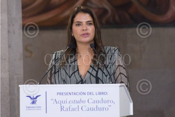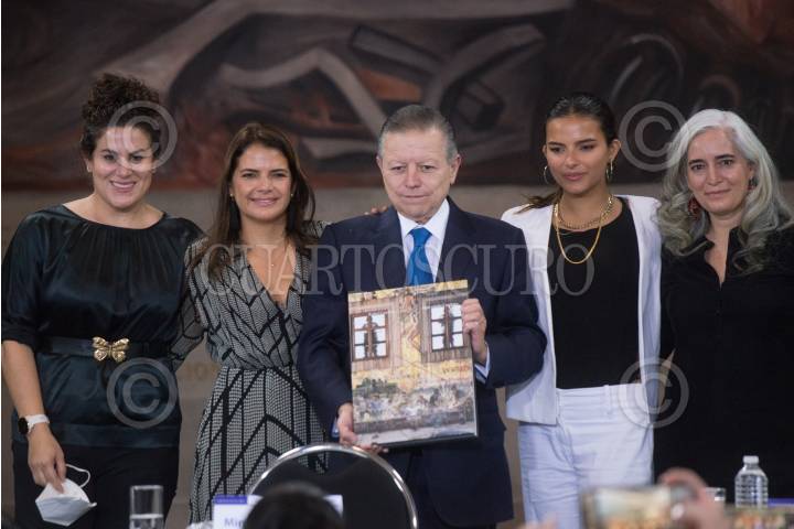 Arturo Zaldívar, ministro presidente del Alto Tribunal y del Consejo de la Judicatura Federal (CJF); junto a Paola Pineda Córdova, directora de Proyectos Artísticos de la SCJN; Liliana Pérez Cano, directora de la Casa Estudio Rafael Cauduro; Elena Cauduro Pérez, y Alesha Mercado, historiadora y curadora, presentaron el libro “Aquí estuvo Cauduro, Rafael Cauduro” que recopila la trayectoria del artista mexicano.