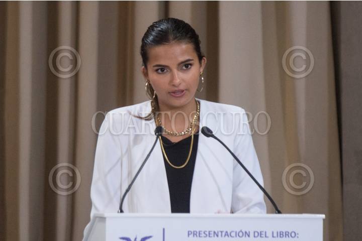 Elena Cauduro Pérez, hija de Rafael Cauduro, durante la presentación del libro “Aquí estuvo Cauduro, Rafael Cauduro” que recopila la trayectoria del artista mexicano.