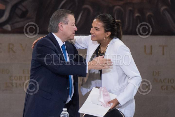 Arturo Zaldívar, ministro presidente del Alto Tribunal y del Consejo de la Judicatura Federal (CJF), Elena Cauduro Pérez, hija de Rafael Cauduro, durante la presentación del libro “Aquí estuvo Cauduro, Rafael Cauduro” que recopila la trayectoria del artista mexicano.