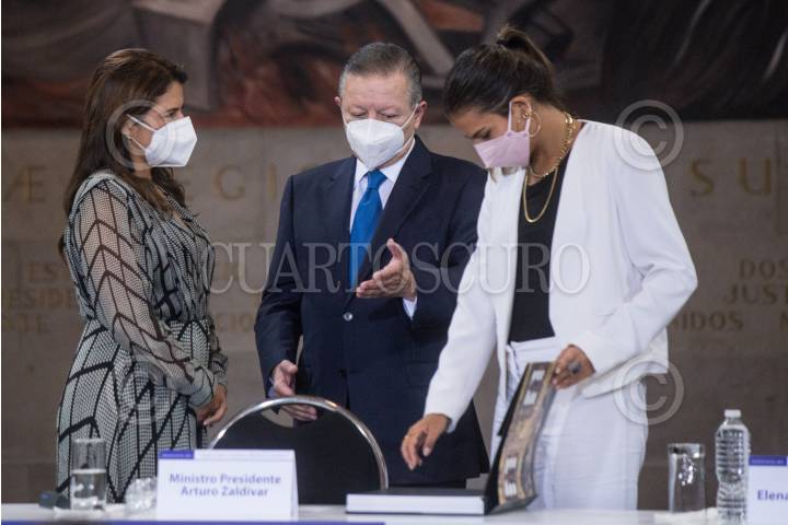 Arturo Zaldívar, ministro presidente del Alto Tribunal y del Consejo de la Judicatura Federal (CJF); Liliana Pérez Cano, directora de la Casa Estudio Rafael Cauduro, y Elena Cauduro Pérez, hija de Rafael Cauduro, durante la presentación del libro “Aquí estuvo Cauduro, Rafael Cauduro” que recopila la trayectoria del artista mexicano.