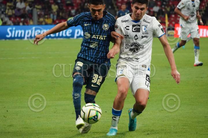 Los jugadores Leo Suárez (América) y Rafael Fernández (Querétaro) disputaron el balón durante el partido de la Clausura 2023 en el Estadio Azteca