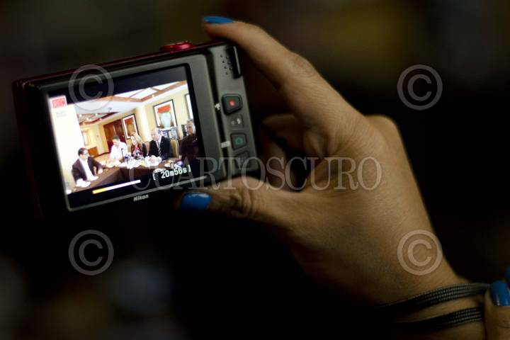 MÉXICO, D.F., 27JULIO2013.- Rafael Guarneros, del Movimiento Nacional Panista, acompañado de militantes del Patido Acción Nacional (PAN), miliantes de base o de "a pie"; encabezó una conferencia de prensa en la cual dieron su postura respecto a los acuerdos durante la Asamblea Nacional Extraordinaria del PAN, en el cual reconoce el derecho de los militantes a votar y elegir de forma directa a los Presidentes de los Comités Directivos Municipales,Estatales y Nacional. Además suscribieron una carta dirigida a los dirigentes del partido. En la imagen, una periodista toma una fotografía de la conferencia. FOTO: MISAEL VALTIERRA / CUARTOSCURO.COM