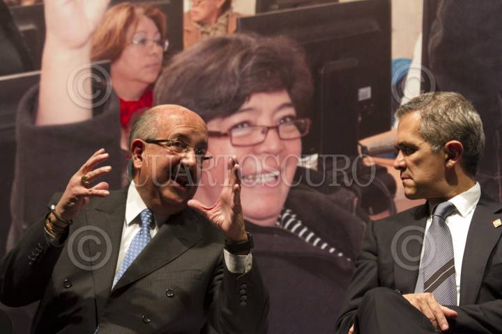 CIUDAD DE MÉXICO, 30JUNIO2016.- Rafael López Castañares, Director General del CENEVAL, y Miguel Ángel Mancera, Jefe de Gobierno de la ciudad, durante un encuentro con maestros capitalinos en el Plaza Condesa. El mandatario capitalino asistió al Encuentro Contigo Maestr@, donde informó que el próximo domingo, 104 maestros de preescolar y 225 de primaria presentarán examen para titularse. FOTO: MOISÉS PABLO /CUARTOSCURO.COM