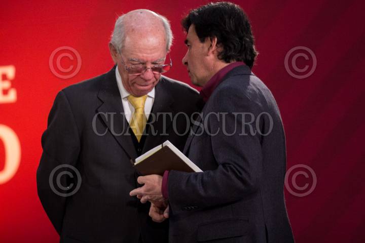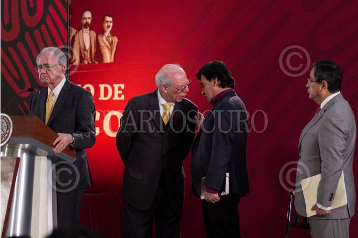 CIUDAD DE MÉXICO, 28FEBRERO2019.- Javier Jiménez Espriú, secretario de Comunicaciones y Transportes, dio detalles de como han avanzado las investigaciones respecto al accidente del pasado 24 de diciembre de 2018, donde murieron la gobernadora de Puebla, Martha Erika Alonso y su esposo el senador Rafael Moreno Valle, esto tras darse a conocer que los audios que integran la investigación fueron reservados hasta dentro de cinco años. Por cuestiones de agenda, el secretario se retiró por lo que el resto de la presentación fue por parte de Carlos Morán Moguel, subsecretario de Transporte. En la imagen Jiménez Espríu y Moran Moguel conversando con Jesús Ramírez Cuevas, vocero de la presidencia. FOTO: GALO CAÑAS /CUARTOSCURO.COM