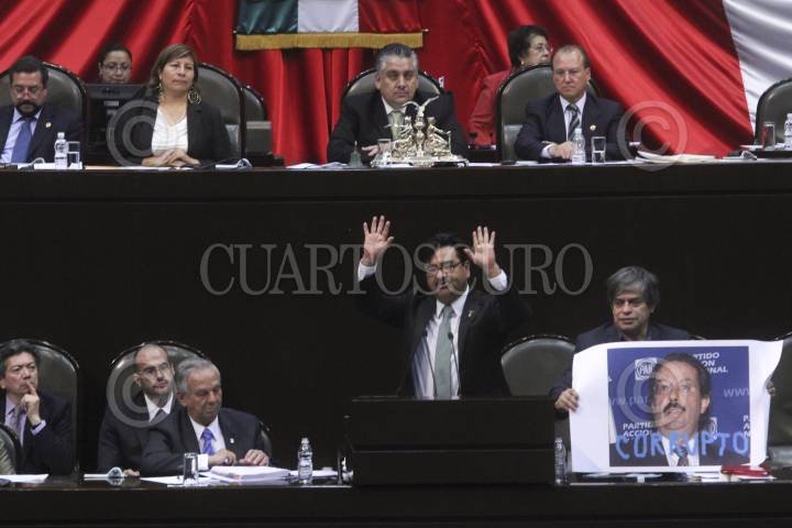 MÉXICO, D.F., 07MARZO2012.- Agustin Guerrero, diputado del PRD, mostro una fotografia de Juan Molinar Horcasitas en la comparecencia de Rafael Morgan Ríos, Secretario de la Función Pública. FOTO: ENRIQUE ORDÓÑEZ /CUARTOSCURO.COM