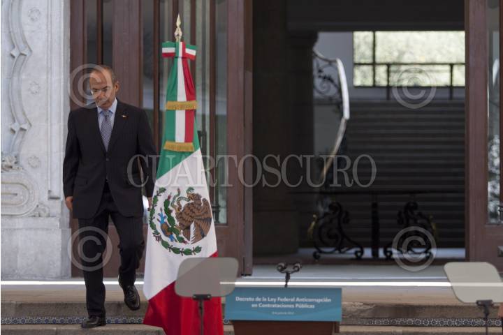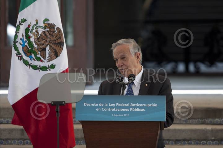 MÉXICO, D.F., 08JUNIO2012.- Rafael Morgán Ríos, secretario de la Función Pública, durante la firma de decreto de la "Ley Anticorrupción en Contrataciones Públicas", en las escalinatas de la residencia oficial de Los Pinos. FOTO: MOISÉS PABLO /CUARTOSCURO.COM
