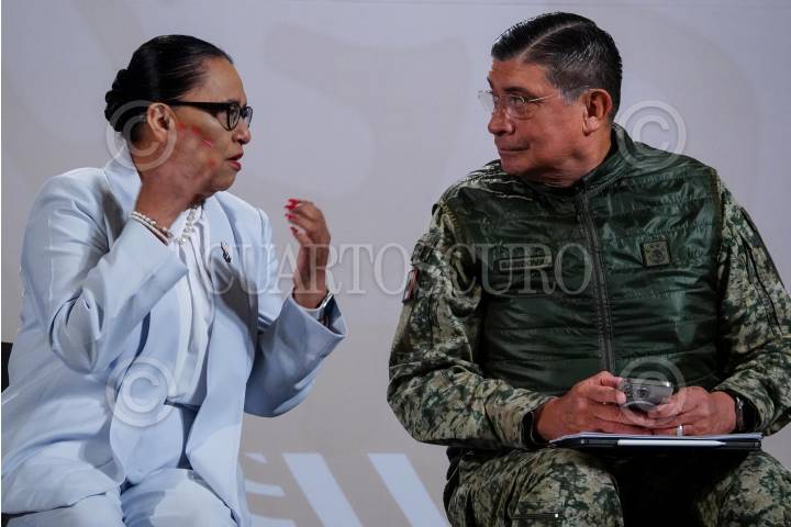 CIUDAD DE MÉXICO, 23JULIO2024.- Rosa Icela Rodríguez, secretaria de Seguridad Pública y Protección Ciudadana, y Luis Cresencio Sandoval, secretario de la Defensa Nacional, durante la conferencia matutina desde Palacio Nacional en la que se abordó el informe quincenal en materia de Seguridad. FOTO: GALO CAÑAS/CUARTOSCURO.COM