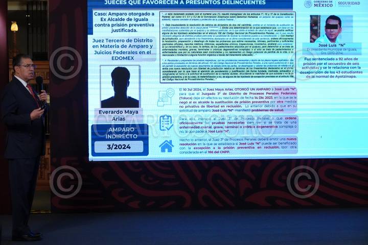 CIUDAD DE MÉXICO, 23JULIO2024.- Luis Rodríguez Bucio, subsecretario de Seguridad Pública, muestra la ficha del juez Everardo Maya Arias, quien benefició a José Luis “N” al otorgarle un amparo. Lo anterior, durante la conferencia matutina desde Palacio Nacional en la que se abordó el informe quincenal en materia de Seguridad. FOTO: GALO CAÑAS/CUARTOSCURO.COM