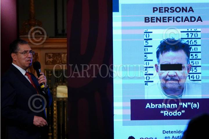 CIUDAD DE MÉXICO, 23JULIO2024.- Luis Rodríguez Bucio, subsecretario de Seguridad Pública, muestra la ficha de Abraham “N” alias “Don Rodo” beneficiado por un juez federal. Lo anterior, durante la conferencia matutina desde Palacio Nacional en la que se abordó el informe quincenal en materia de Seguridad. FOTO: GALO CAÑAS/CUARTOSCURO.COM