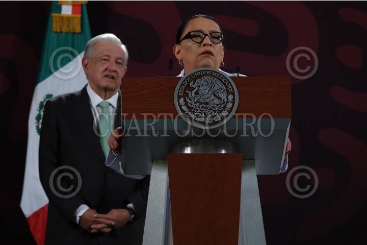 CIUDAD DE MÉXICO, 06AGOSTO2024.- Rosa Icela Rodríguez, secretaria de Seguridad Pública y Protección Ciudadana, habló sobre la política en materia de género y prevención de los crímenes contra las mujeres durante la conferencia de prensa matutina en la que se presentó el informe quincenal en materia de seguridad. FOTO: GALO CAÑAS/CUARTOSCURO.COM