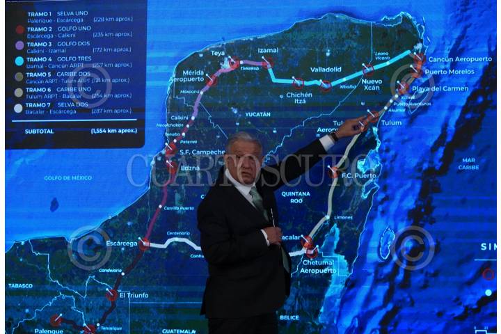 CIUDAD DE MÉXICO, 23JULIO2024.- Andrés Manuel López Obrador, presidente de México, da detalles sobre la continuidad de los trabajos del Tren Maya durante la conferencia matutina desde Palacio Nacional en la que se abordó el informe quincenal en materia de Seguridad. FOTO: GALO CAÑAS/CUARTOSCURO.COM