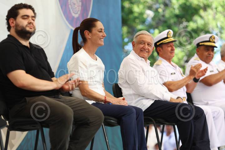 GUAYMAS, SONORA, 24AGOSTO2024.- Juan Pablo de Botton Falcón, subsecretario de Egresos de la Secretaría de Hacienda y Crédito; Claudia Sheinbaum Pardo, presidenta electa de México; Andrés Manuel López Obrador, presidente de México, y José Rafael Ojeda, secretario de Marina, encabezaron el evento de administración del Sistema Portuario Nacional – Guaymas e inauguración de obras en la Plaza de los Tres Presidentes. FOTO: PRESIDENCIA/CUARTOSCURO.COM