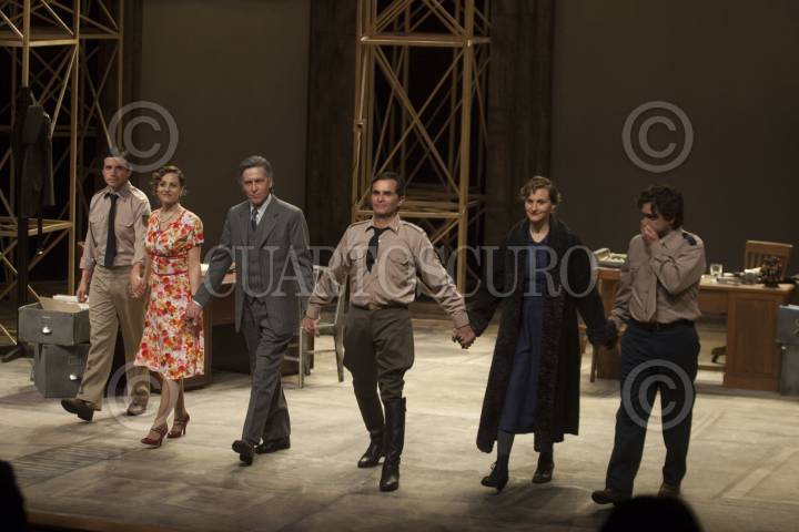 MÉXICO, D.F., 12ENERO2013.- Los Actores, Humberto Zurita, Rafael Sánchez Navarro, Marina de Tavira, Stefanie Weiss, Sergio Bonilla y Martín Altomaro protagonizan "Tomar Partido" escrito por el sudafricano Ronald Harwood y que se presenta en el Centro Cultural Chapultepec donde anoche los dos primeros recibieron por parte de la Asociación de Criticos de Teatro, una estatuilla en reconocimiento a su labor. FOTO: FRANCISCO RODRÍGUEZ / CUARTOSCURO.COM