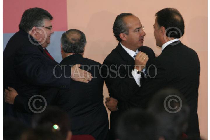 MÉXICO, D.F., 18MAYO2007.- Agustín Carstens, Secretario de Hacienda, Rafel Ochoa Guzman, Secretario General del ISSSTE, Felipe Calderón Hinojosa, presidente de la República y Miguel Angel Yunes Linares, director del ISSSTE, durante la sesión de instalación de la Junta Directiva del ISSSTE en la residencia oficial de los Pinos. FOTO: MOISÉS PABLO/CUARTOSCURO.COM