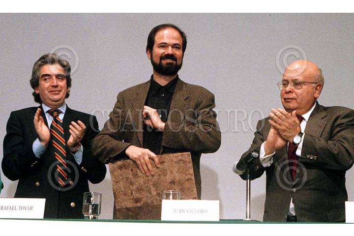 Esta noche el escritor Juan Villoro (centro) recibio el Premio Xavier Villaurrutia de manos de Rafel Tovar y de Teresa, titular de CONACULTA, le aplaude Gerardo Estrada titular del INBA.