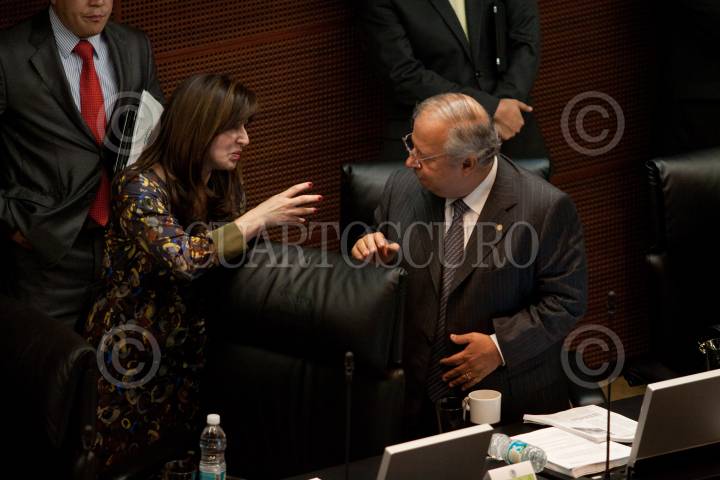 MÉXICO, D.F., 29SEPTIEMBRE2011.- La perredista Rosalinda López, conversa con senador alianzistas Rafel Ochoa Guzmán, en la sesión de la Cámara de Senadores. FOTO: MOISÉS PABLO/CUARTOSCURO.COM